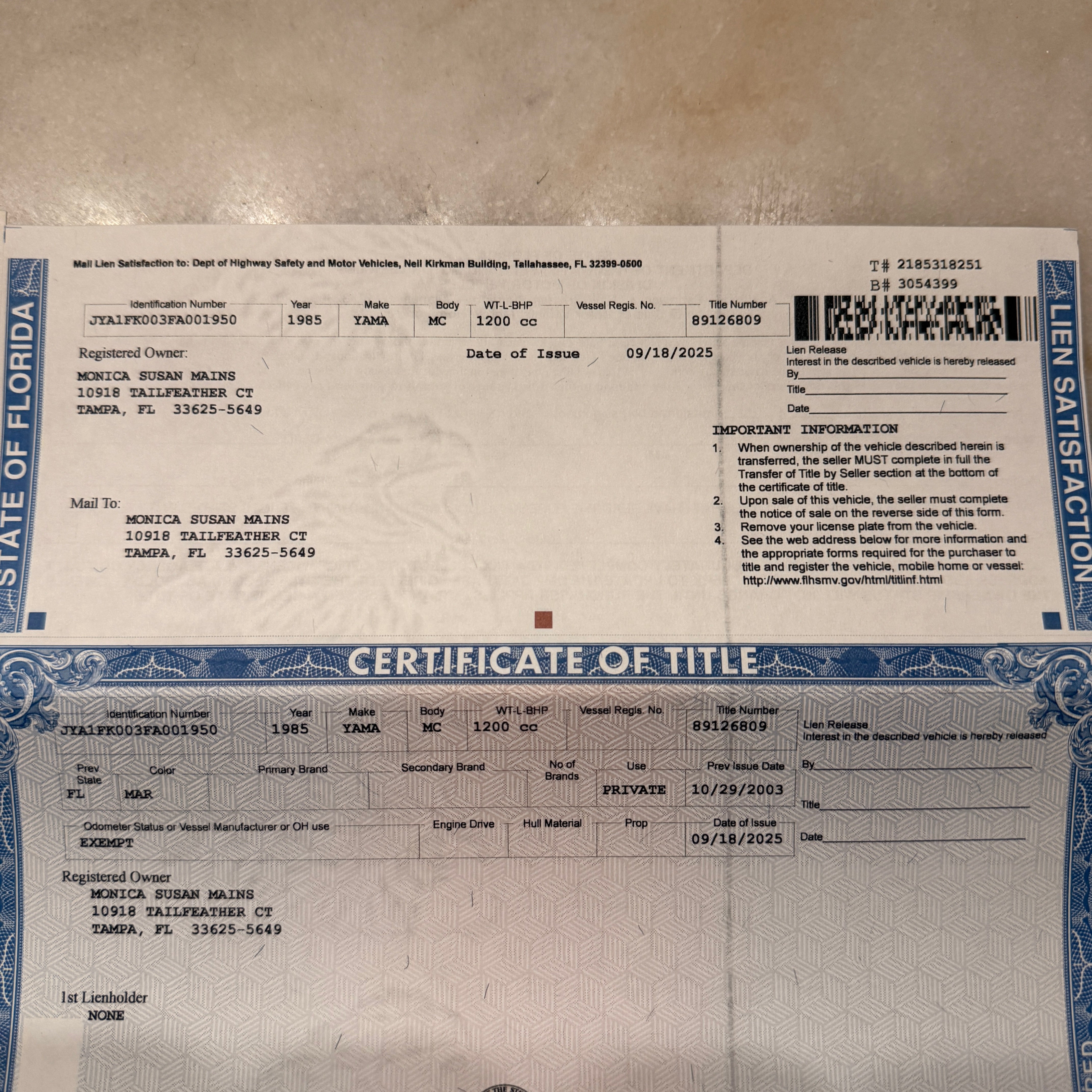 1985–2007 Yamaha VMAX 1200 VMX12 Main Frame Chassis Straight w/Title