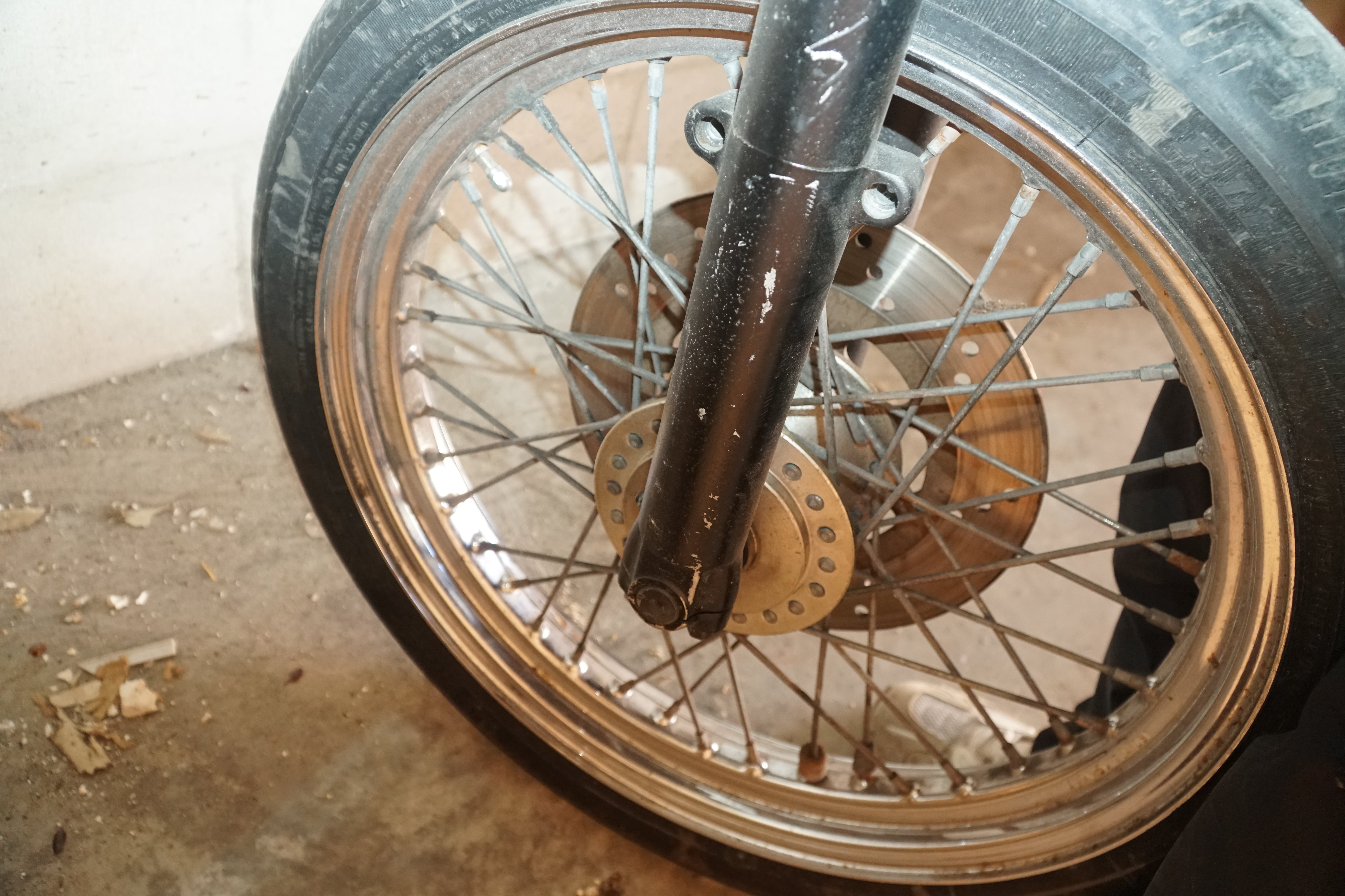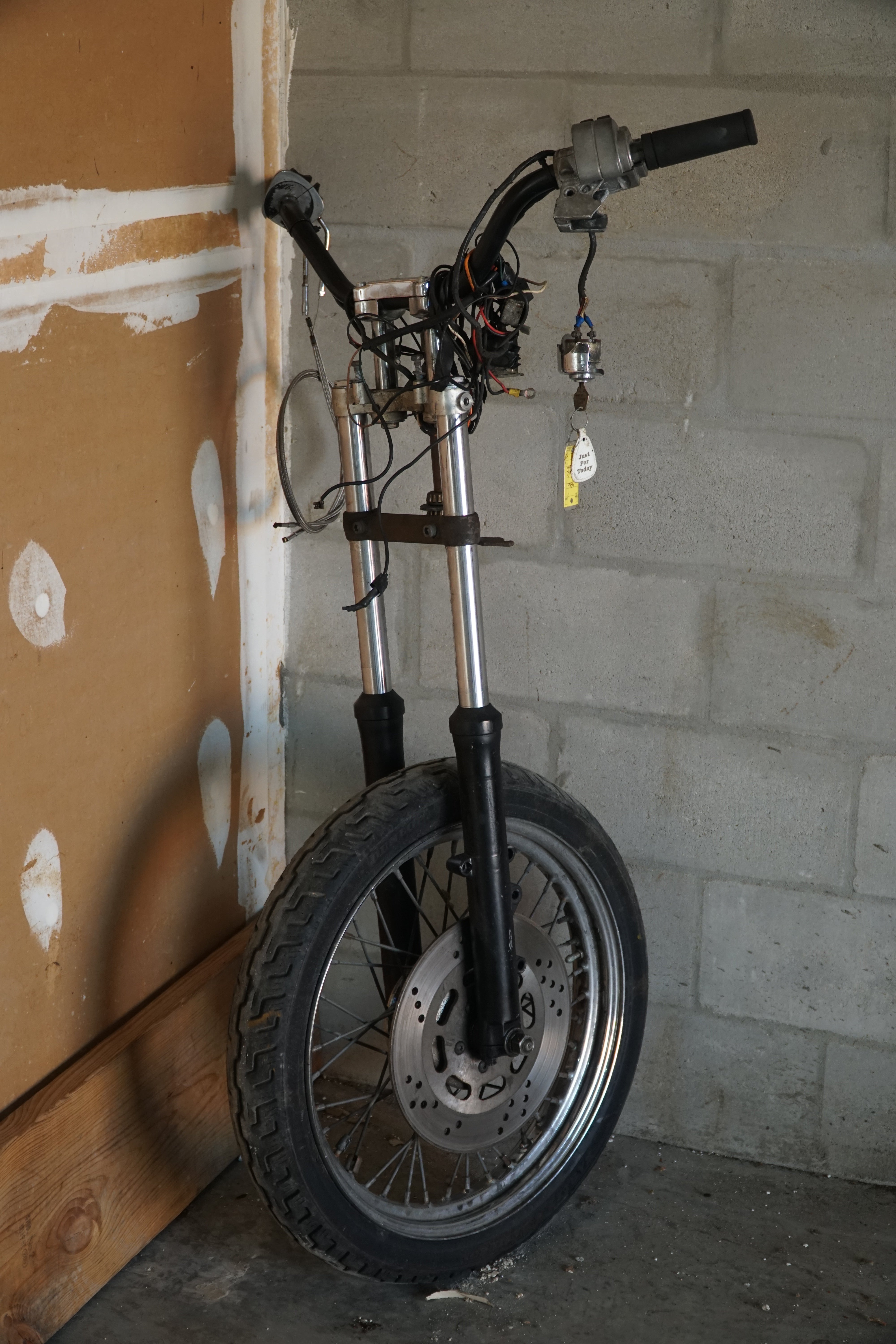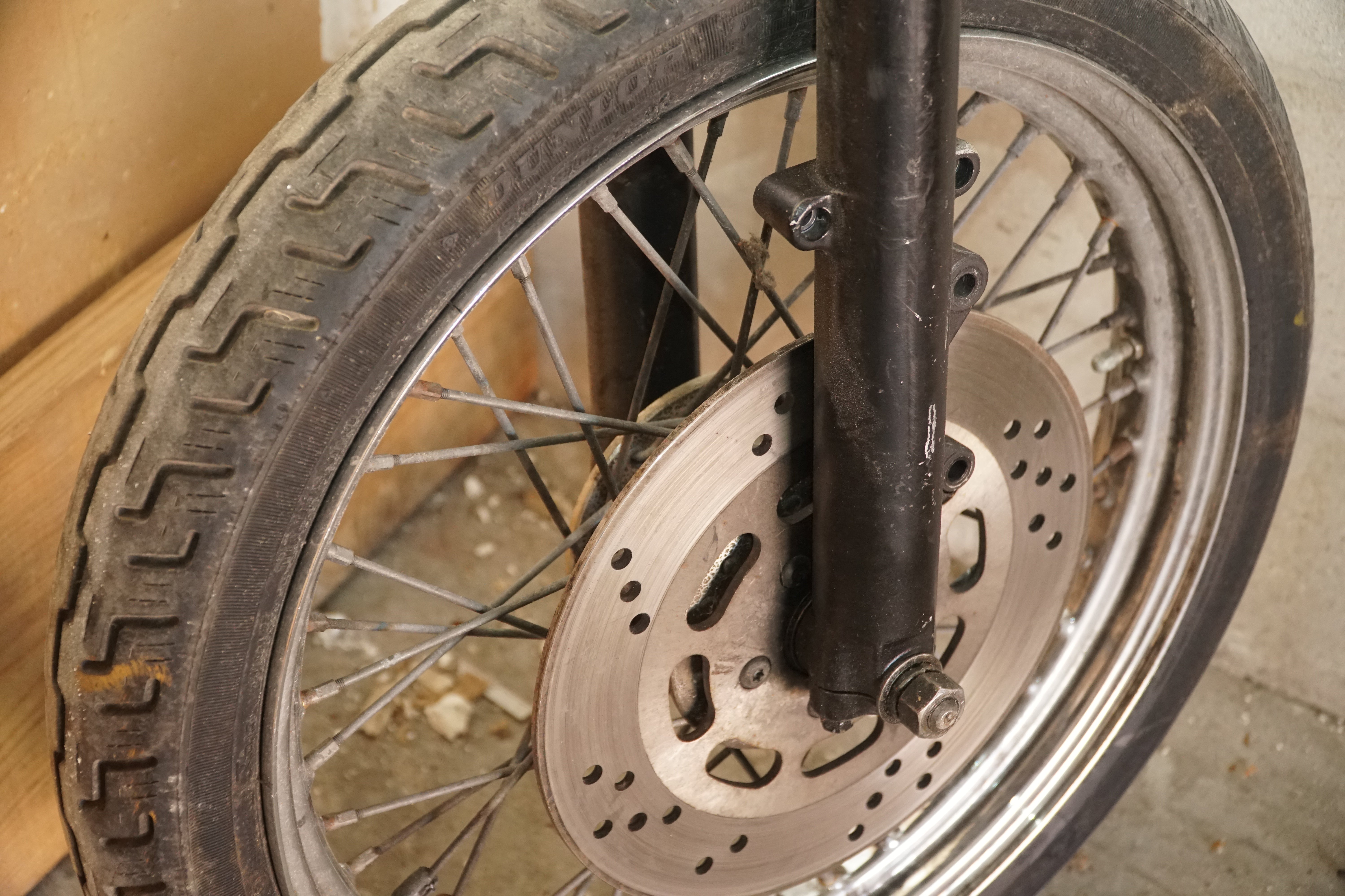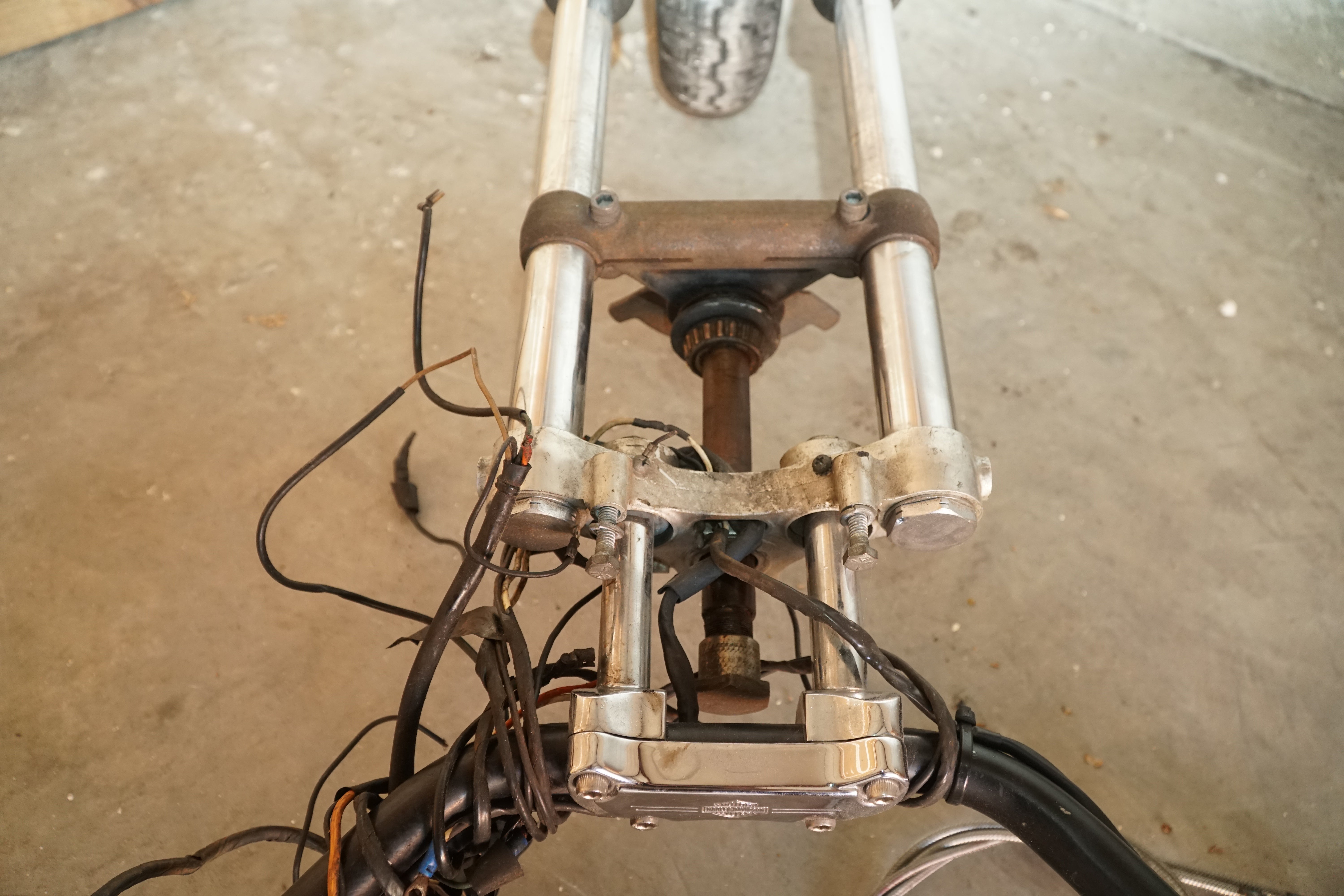 This front end includes the forks, triple trees, front wheel and tire, plus all associated original controls and hardware removed together as a matched assembly. Everything shown is OEM Harley-Davidson, not reproduction parts.