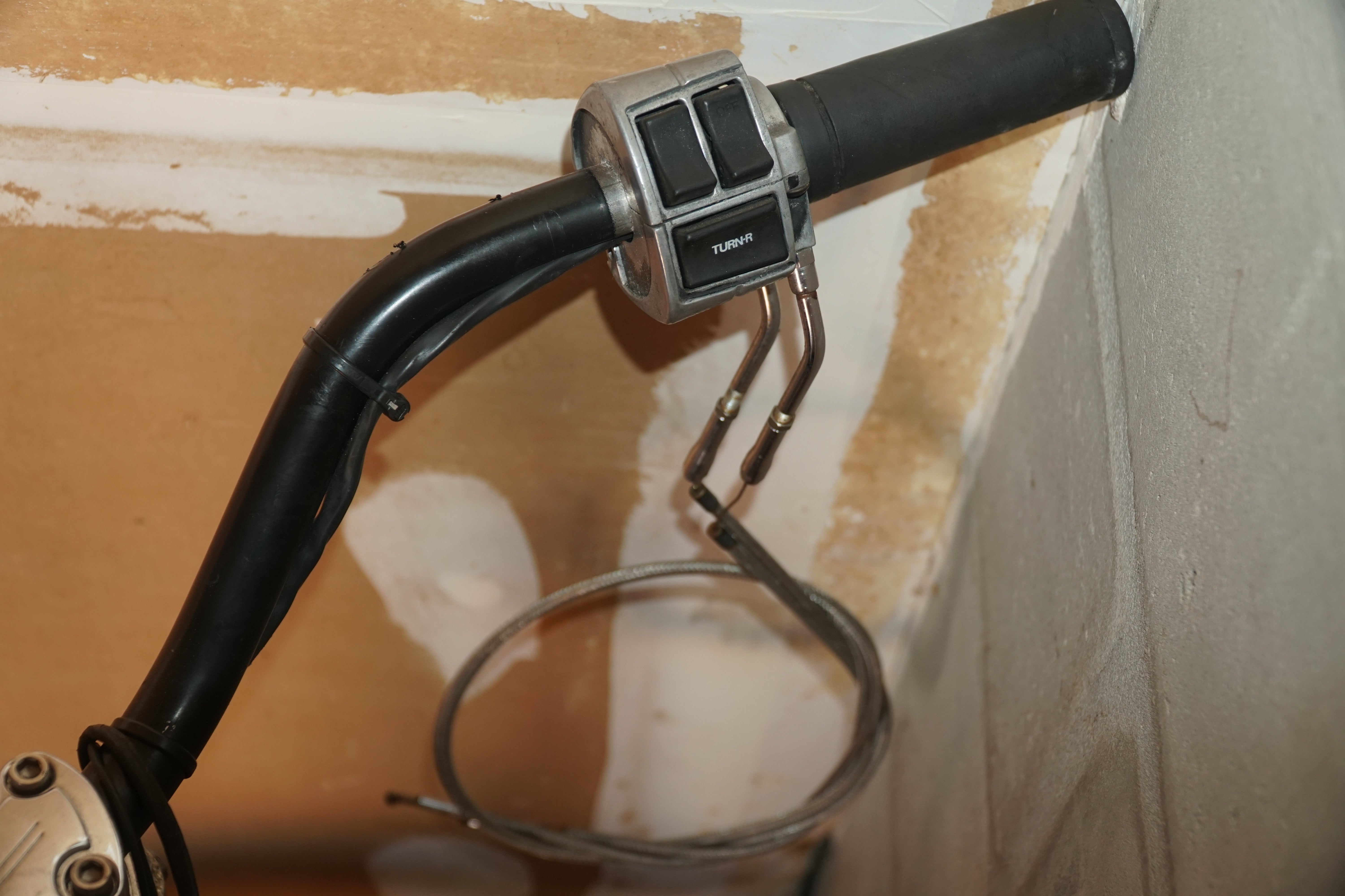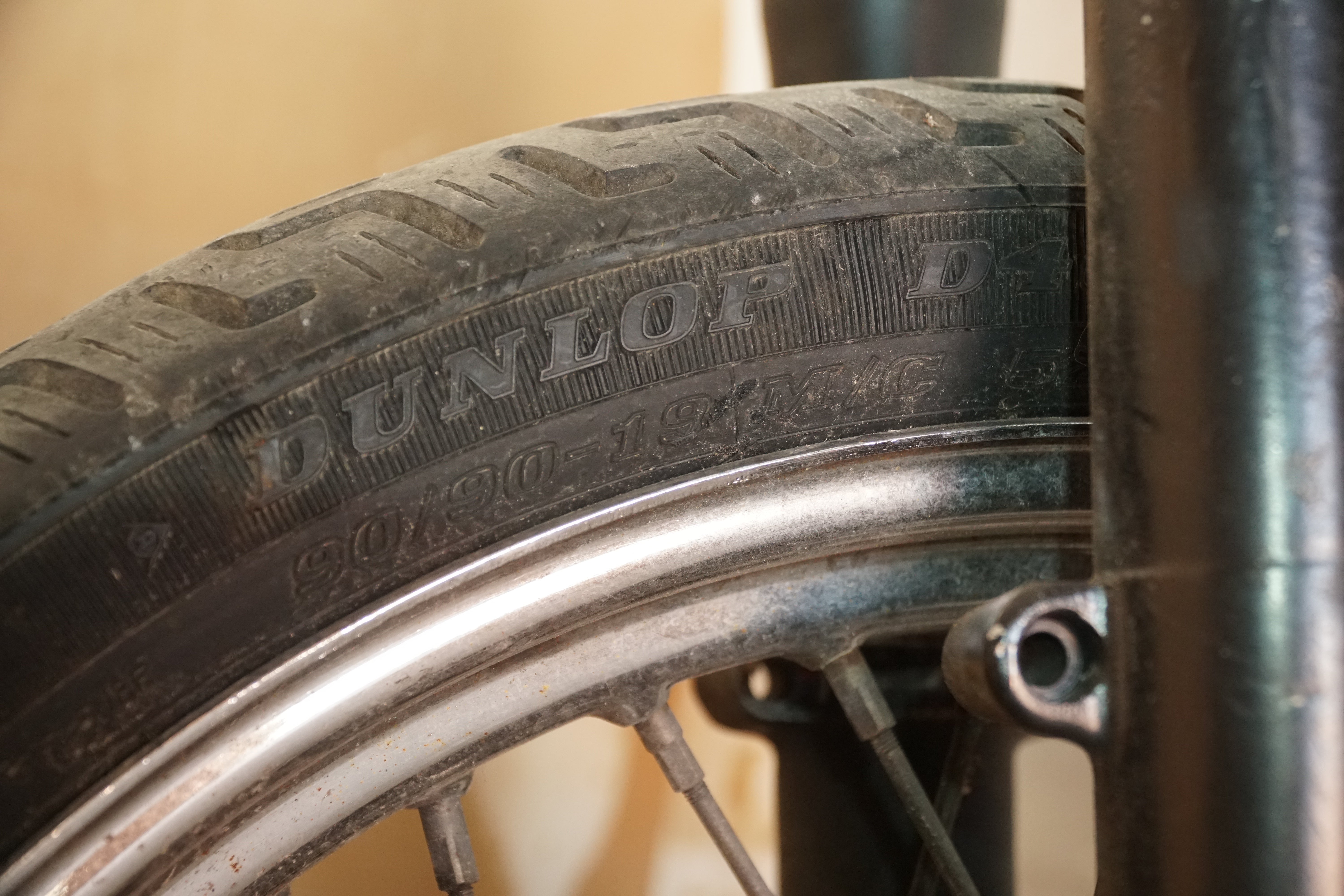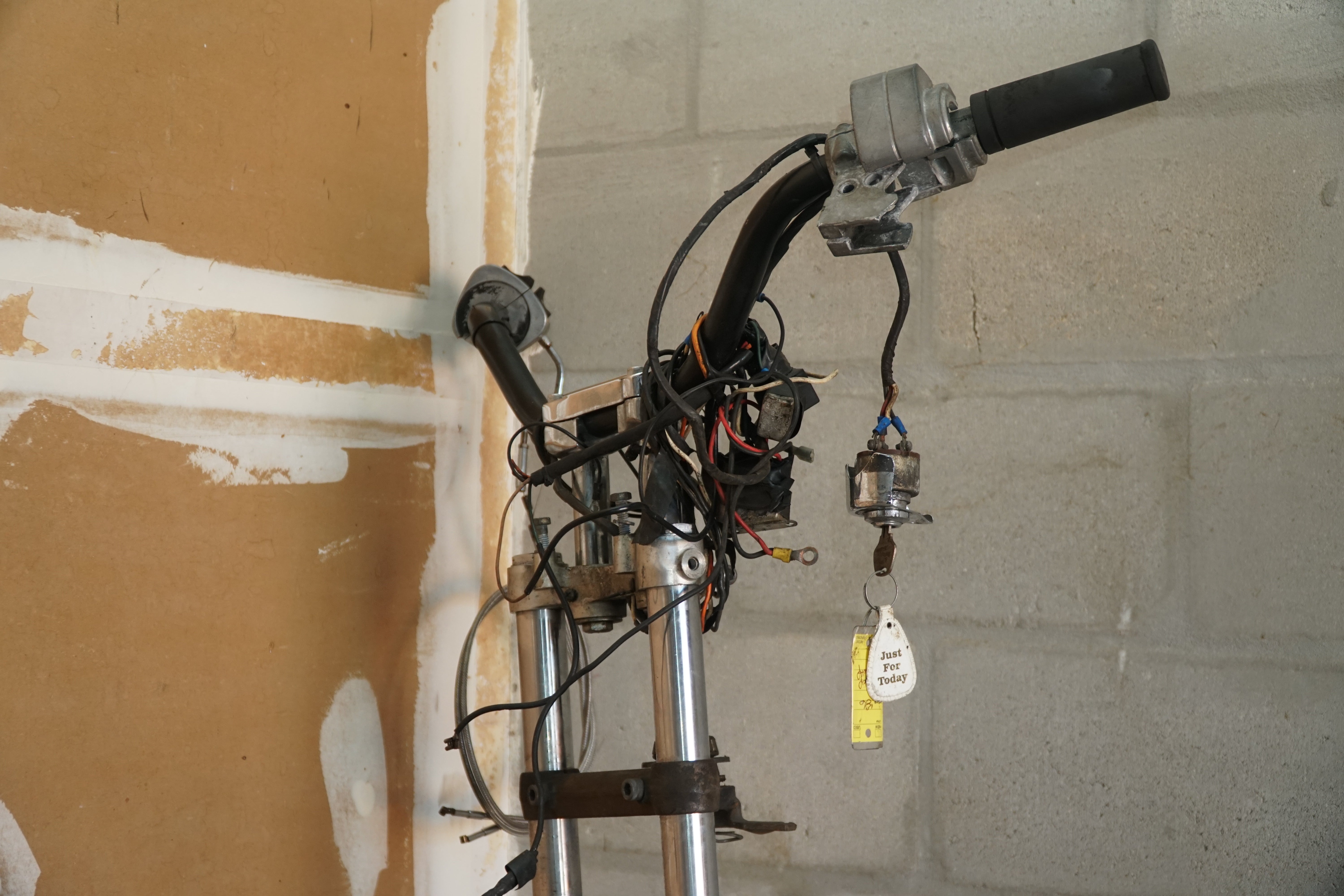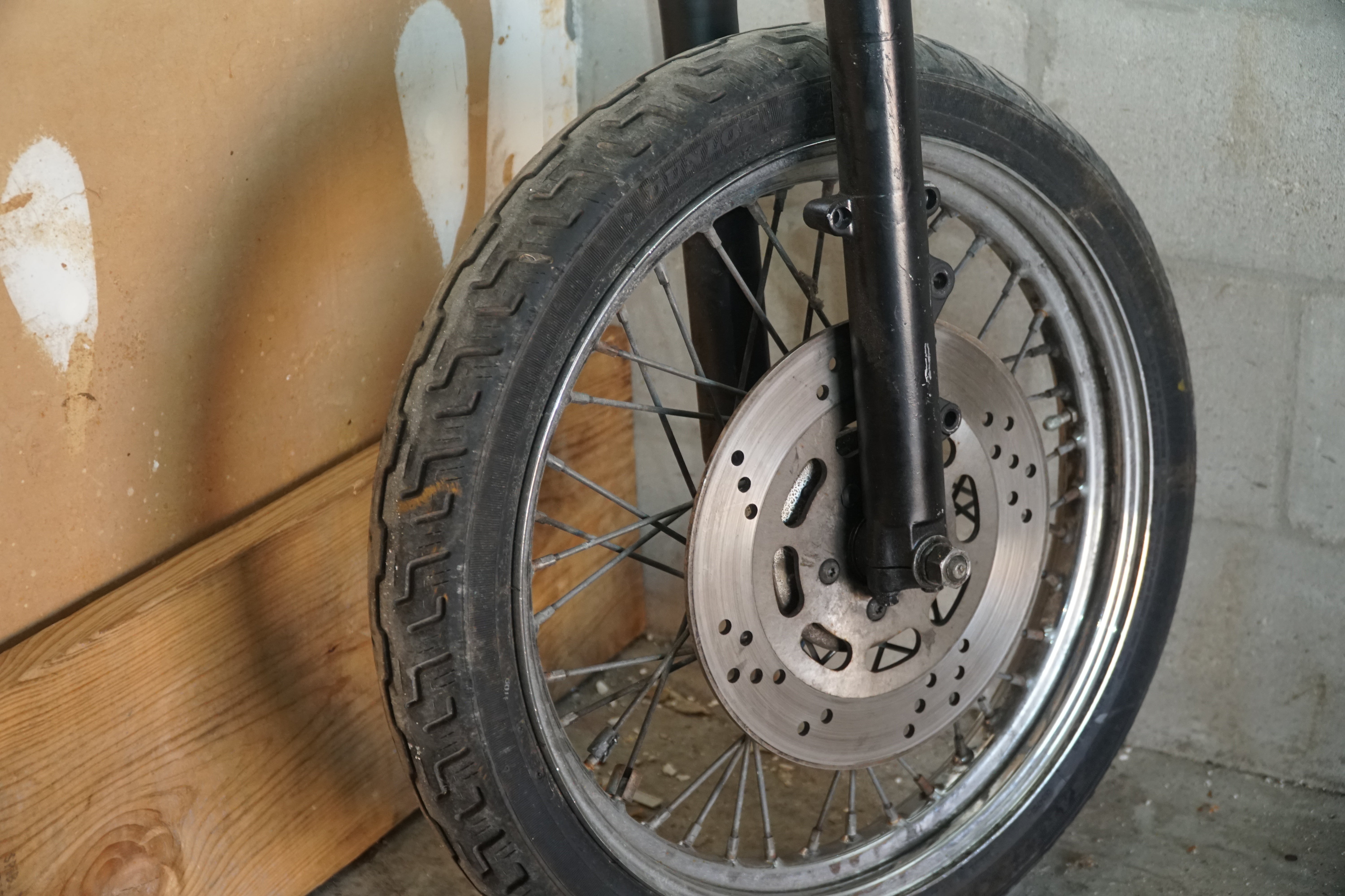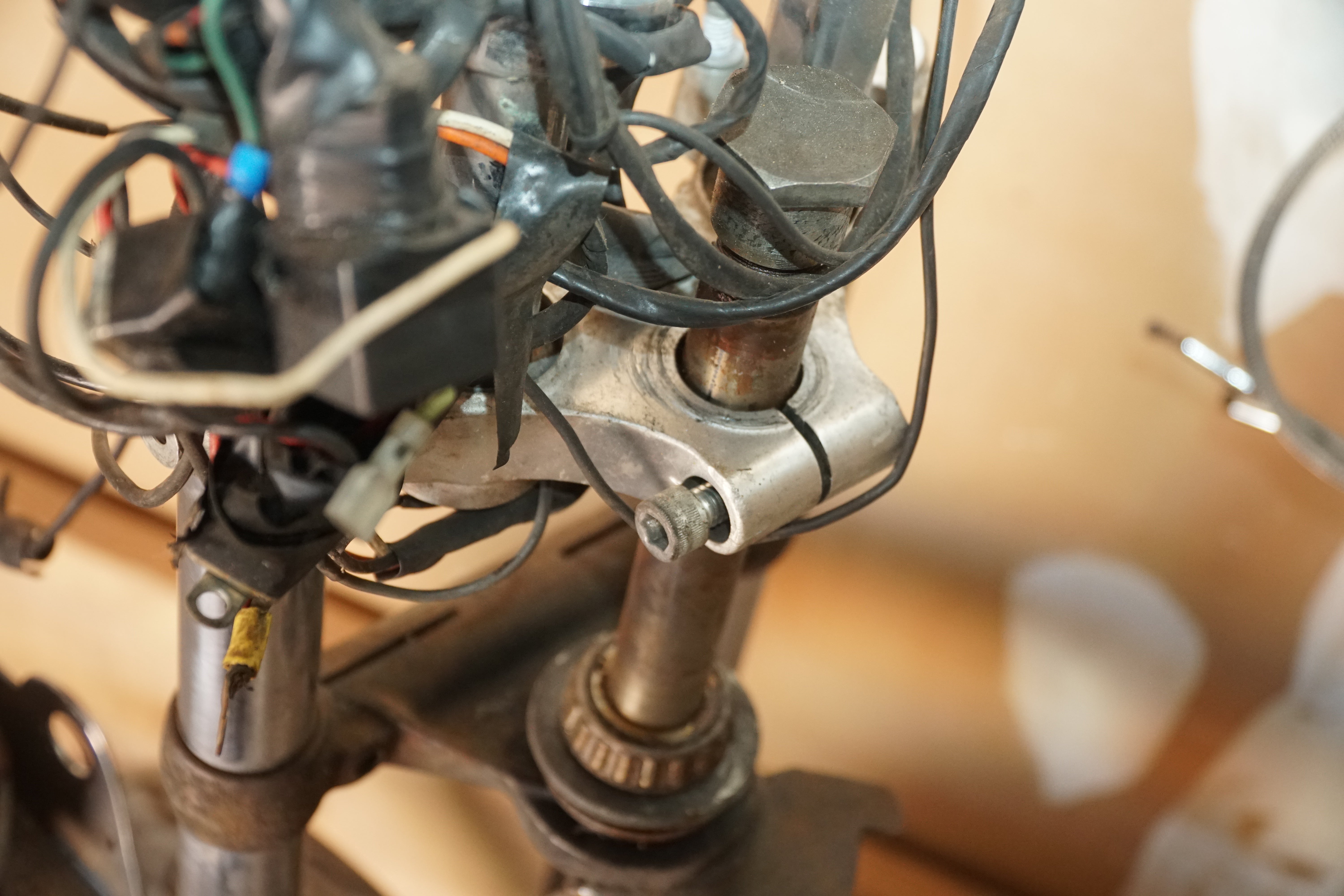 This front end includes the forks, triple trees, front wheel and tire, plus all associated original controls and hardware removed together as a matched assembly. Everything shown is OEM Harley-Davidson, not reproduction parts.