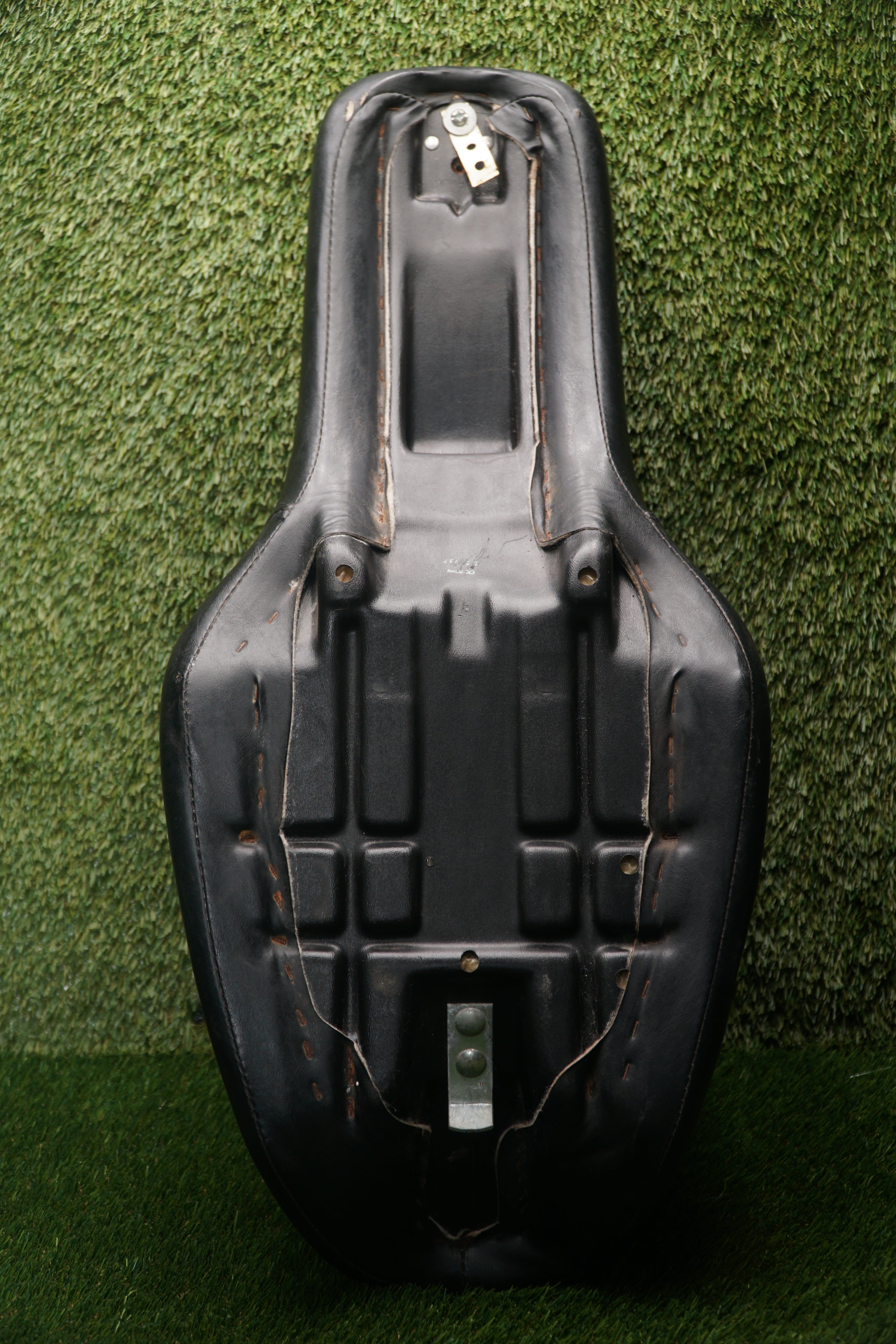 The seat is missing the original rear seat mount, but otherwise complete and ready to bolt up using your existing hardware or a replacement bracket.
