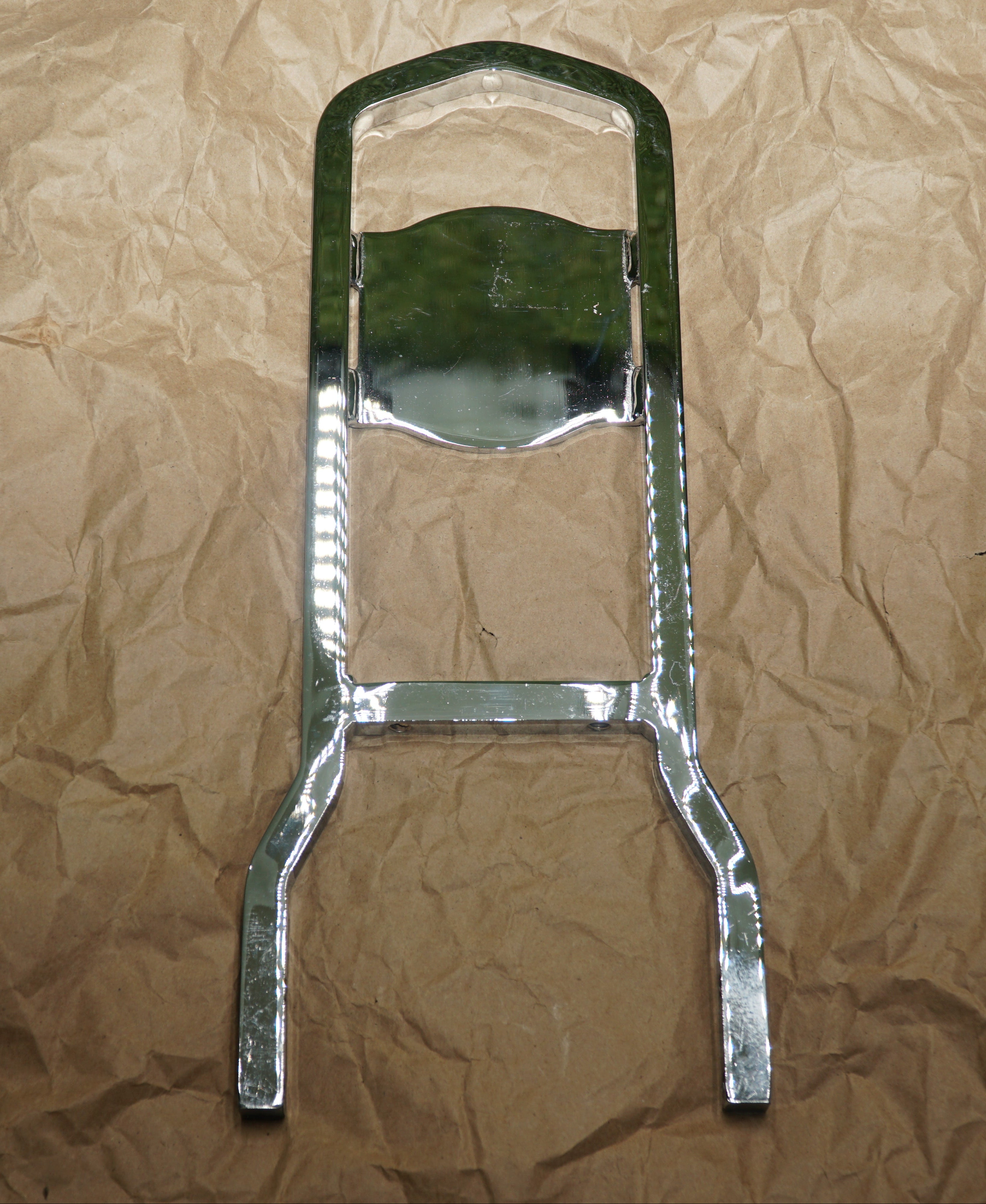 This durable ½” square-stock chrome sissy bar offers a strong, classic look and quick-detach functionality for easy installation and removal. It’s in new condition, never mounted, but does show minor microfiber scratching on the legs from handling and storage.