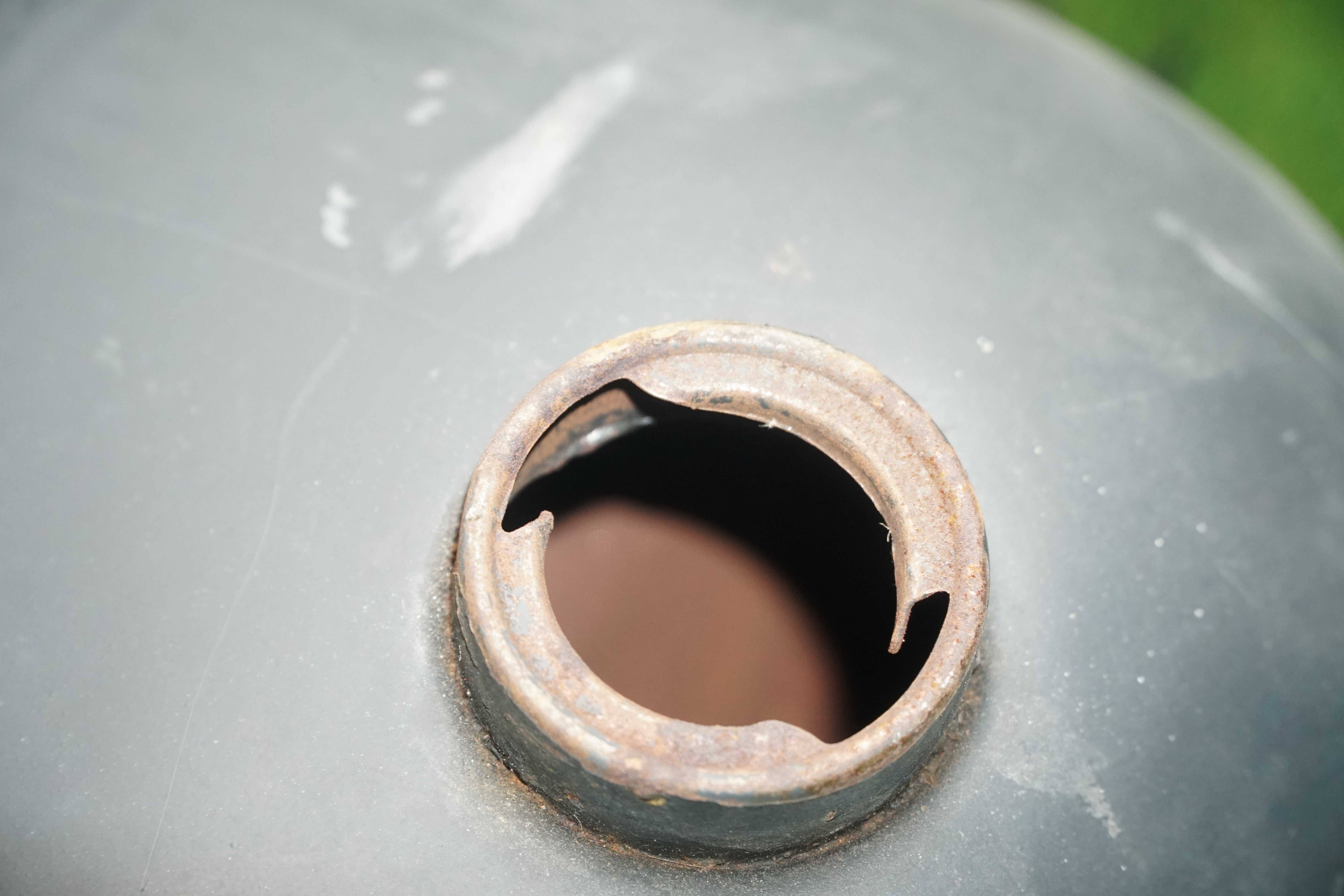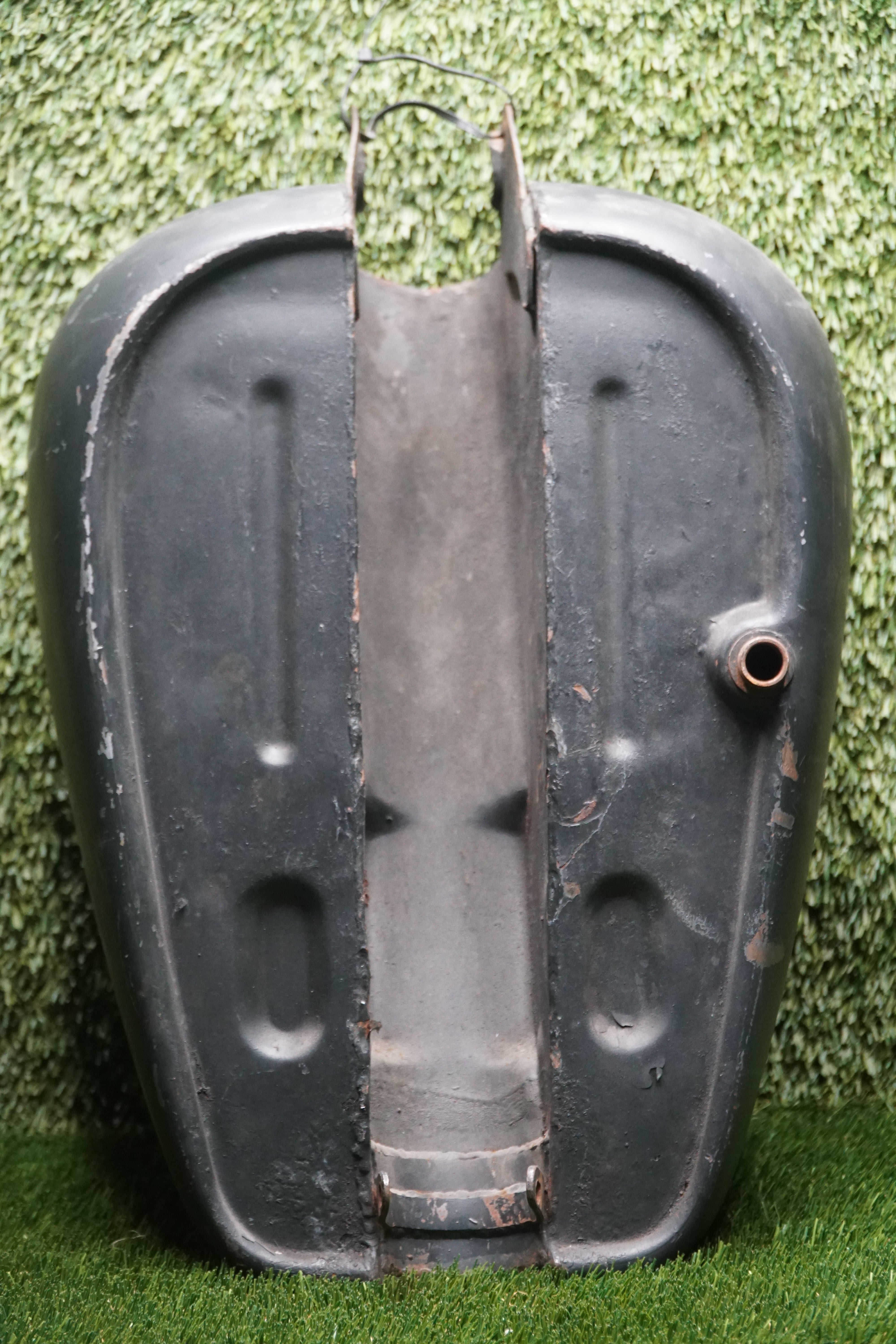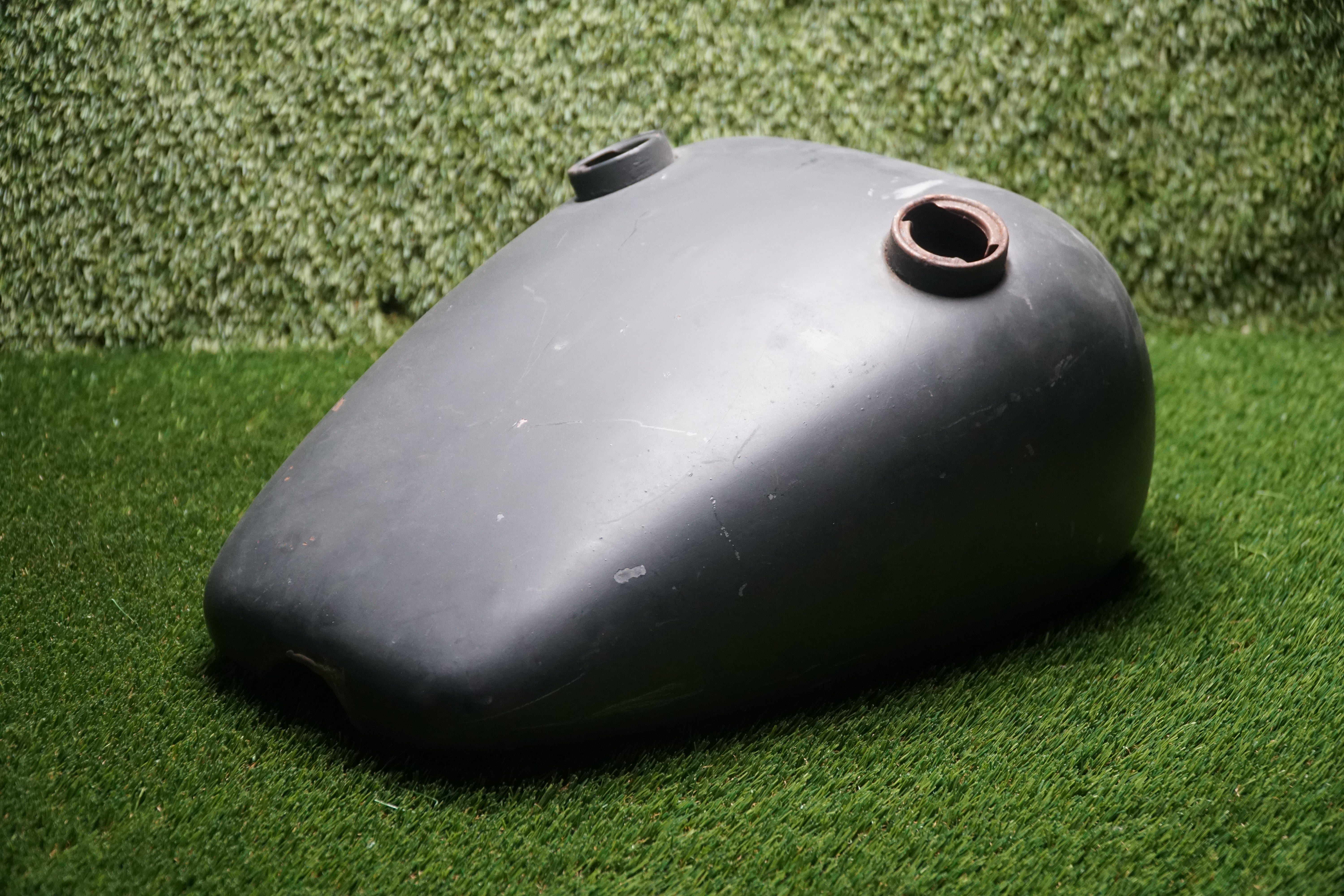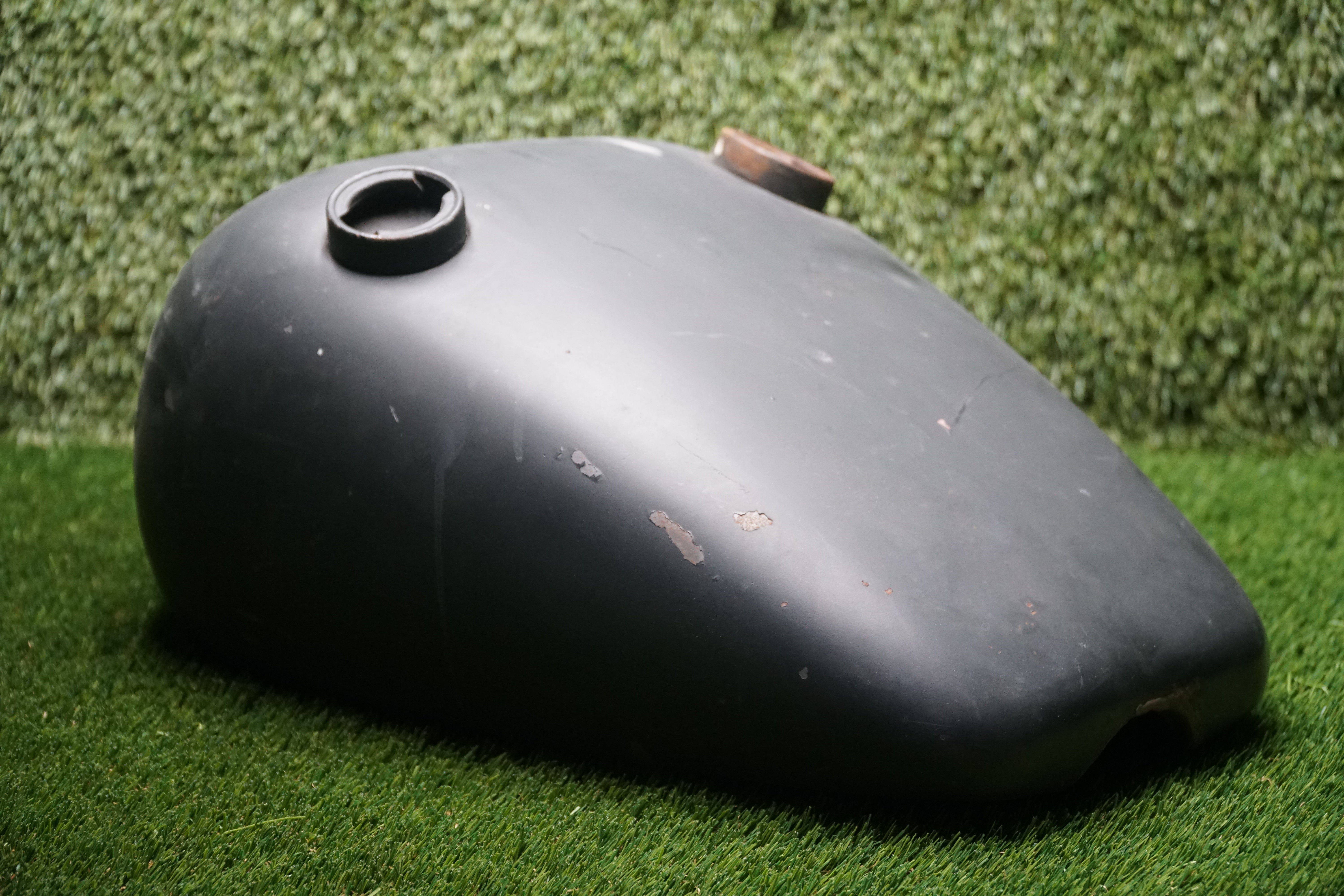 The tank shows typical age wear, including light surface scratches, scuffs, and small dings consistent with age. There are no visible cracks or leaks. The metal is solid and ready for prep, repaint, or patina preservation depending on your build style.